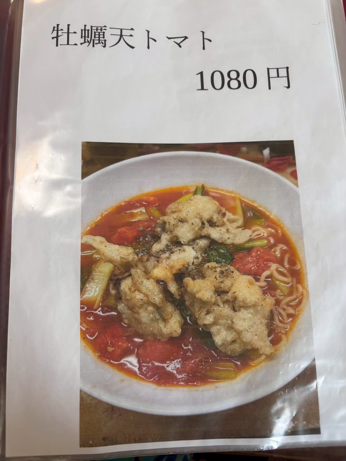 「牡蠣天トマトラーメン」はもちろんのこと、新鮮な生魚(イマユー)から取ったスープとホタテ・牡蠣などのうまみがトマトとマッチした「海鮮トマトつけ麺」や、スープベースからトマトを使った「トマトラーメン」自家製餃子皮のモチモチと海老餡のぷりぷり食感がたまらない「海老餃子」などのメニューもあり、どれにしようか迷ってしまいます。
